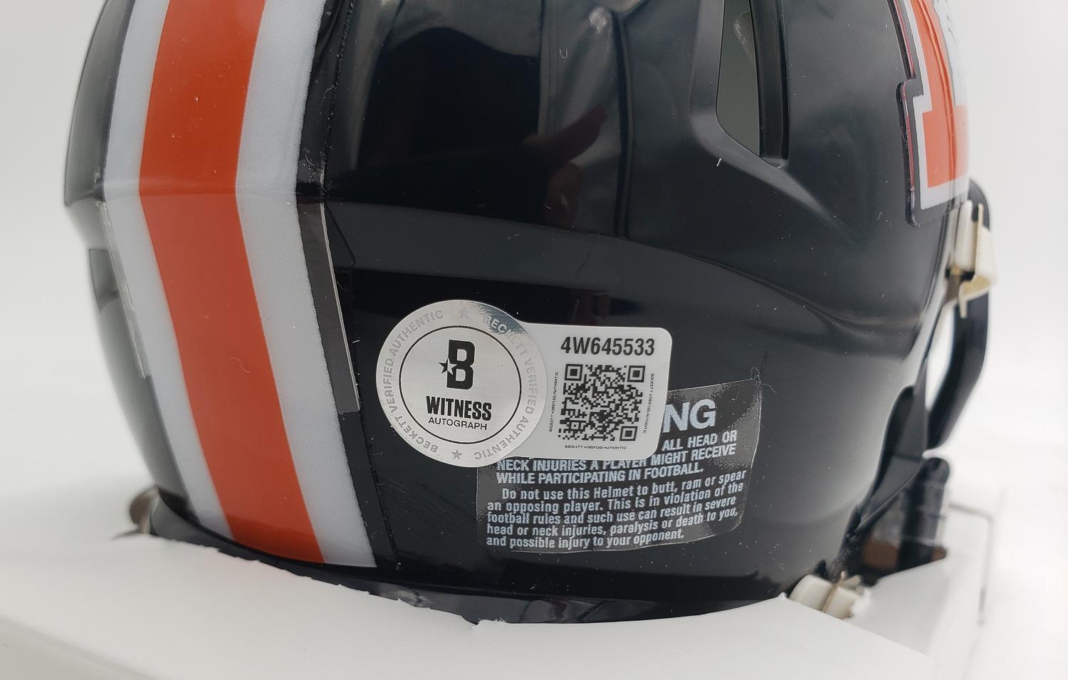 This autographed Riddell Speed mini helmet has been personally hand-signed by Ed McCaffrey of the Denver Broncos. This autograph is certified by Beckett Authentication Services (BAS) Witness Certification. That means that a Beckett representative was present when this item was signed. It comes with the numbered authentication hologram with a QR code that verifies the authentication on the Beckett website.