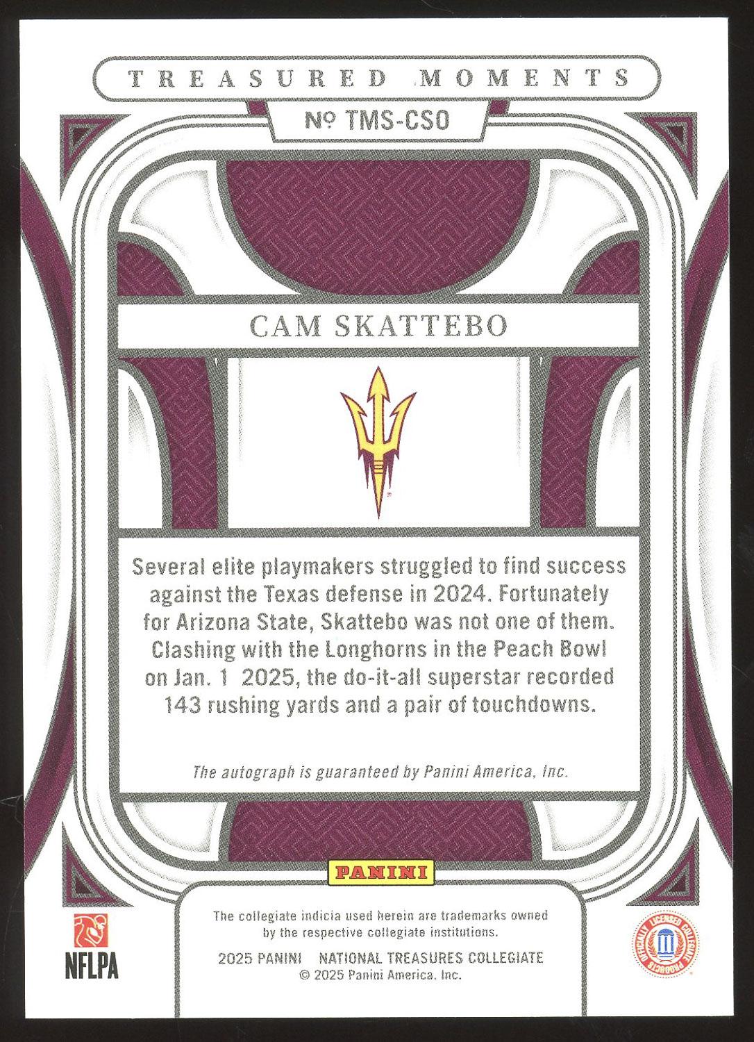 Cam Skattebo 2025 Panini National Treasures Treasured Moments Rookie Auto Card /75. Please see pictures for details on the condition of this card.