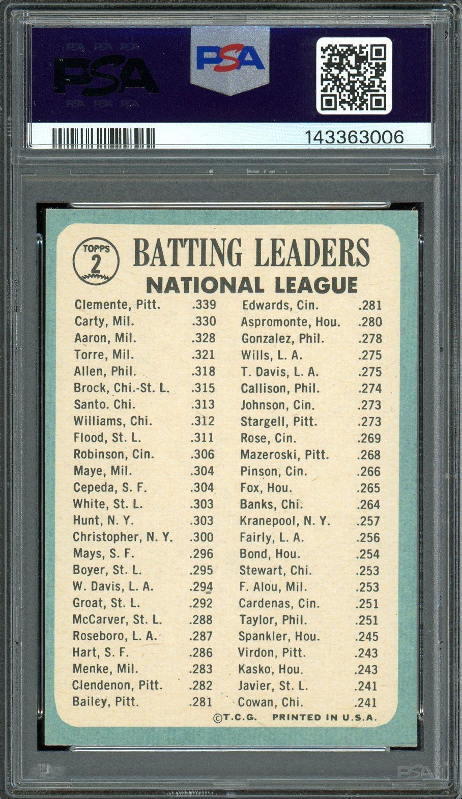 Roberto Clemente, Rico Carty & Hank Aaron 1965 Topps NL Batting Leaders Card #2 PSA 6