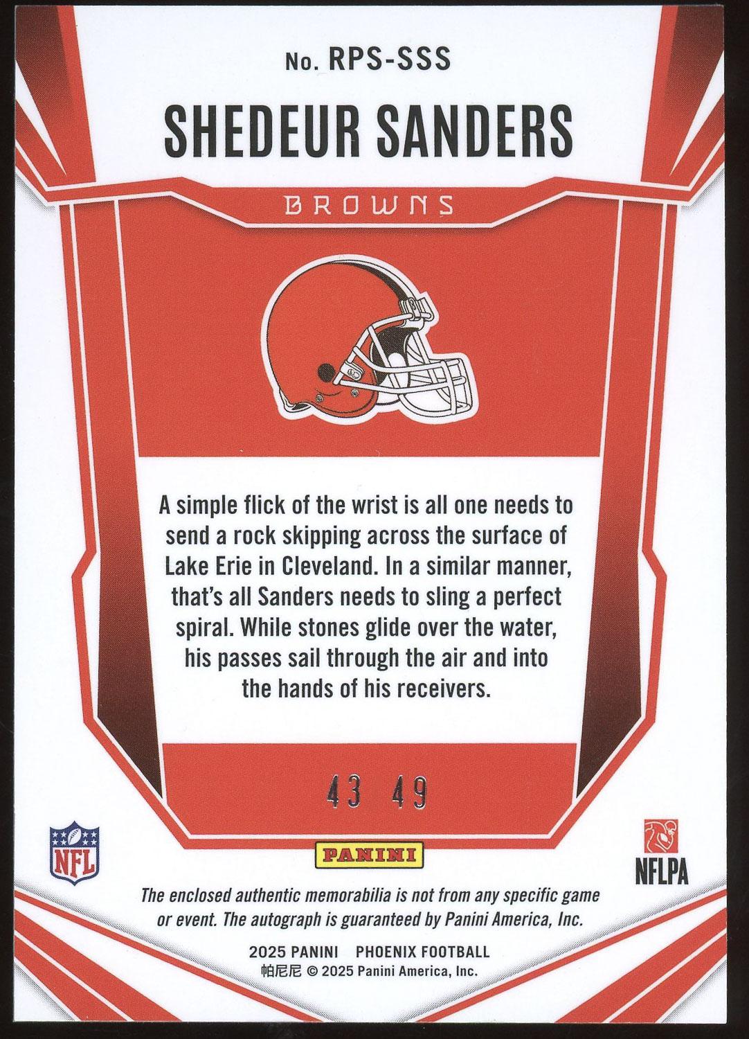 Shedeur Sanders 2025 Panini Phoenix Blue Jumbo Rookie Auto Card /49. Please see pictures for details on the condition of this card.