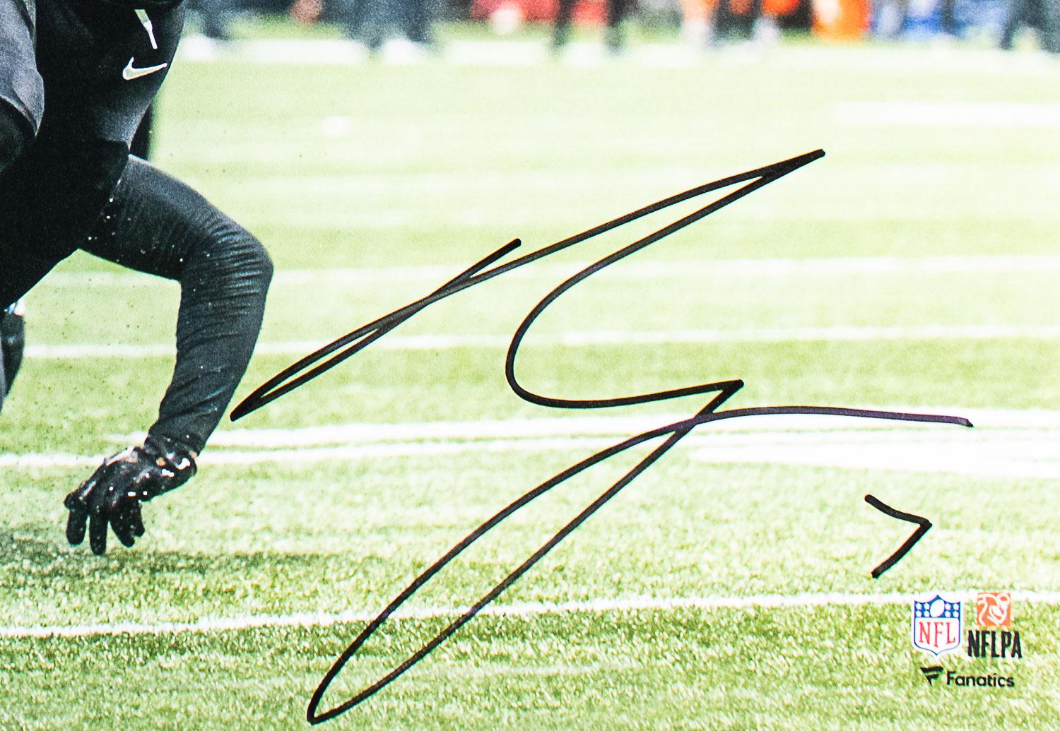 This autographed 16x20 photo has been personally hand-signed by Bijan Robinson of the Atlanta Falcons. This autograph is certified by Beckett Authentication Services (BAS) Certification. It comes with the numbered authentication hologram with a QR code that verifies the authentication on the Beckett website.