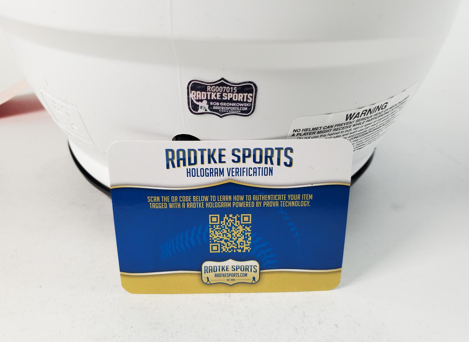 This autographed full size authentic helmet has been personally hand-signed by Rob Gronkowski of the New England Patriots. This autograph is certified by Radtke Sports. It comes with the Certificate of Authenticity and numbered hologram, which can be verified on their website, Radtkesports.com.