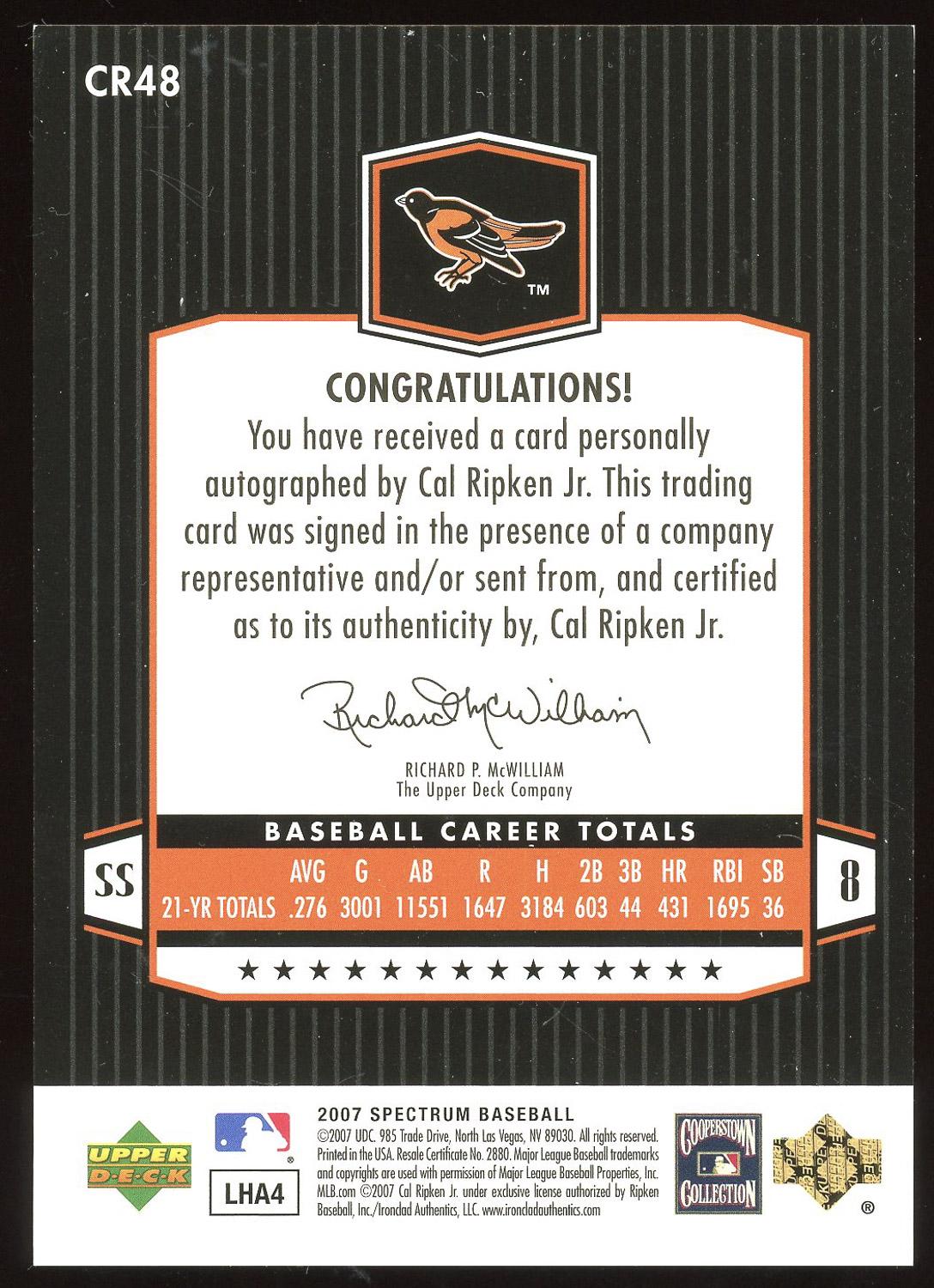 Cal Ripken Jr. 2007 Upper Deck Spectrum Road to the Hall Auto Card. Please see pictures for details on the condition of this card.