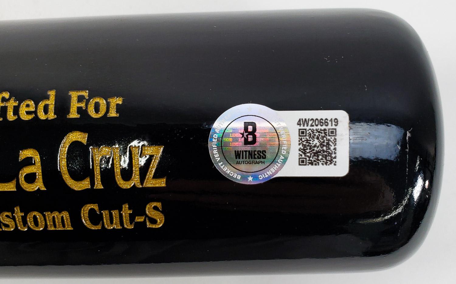 This autographed baseball bat has been personally hand-signed by Elly De La Cruz of the Cincinnati Reds. This autograph is certified by Beckett Authentication Services (BAS) Witness Certification. That means that a Beckett representative was present when this item was signed. It comes with the numbered authentication hologram with a QR code that verifies the authentication on the Beckett website.