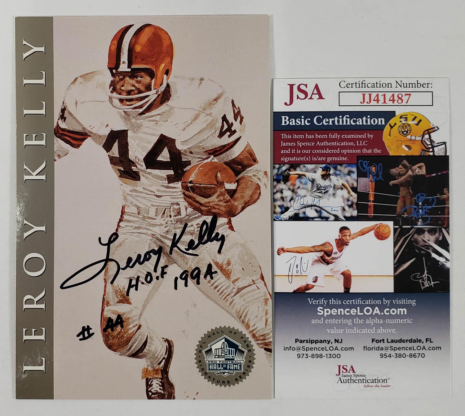 This autographed Hall of Fame Art Card has been personally hand-signed by Leroy Kelly "HOF 1994" of the Cleveland Browns. This autograph is certified by James Spence Authentication (JSA). It comes with the numbered hologram and matching Certificate of Authenticity.